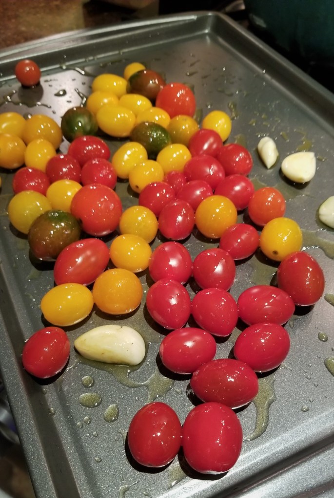 Put cherry tomatoes on a sheet pan along with the garlic, olive oil, seasoned salt and pepper. Lightly toss and roast in the oven till tomatoes start to pop/split and give off their juices, about 20 minutes.