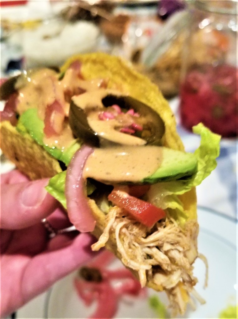 Speaking of toppings, we’ve got lots. Cheese (cheddar for us), sour cream, salsa, chipotle sauce (Grace and I are obsessed), lettuce, diced tomatoes, avocados, radishes, pickled onions and jalapenos. I make my own pickled onions and jalapenos – they are easy to make and last for weeks in the refrigerator. They are spicy with a little sweetness and the recipe is on my blog. There will inevitably be more posts from future Taco Tuesdays as I am always looking for new ways to enjoy tacos! This is the recipe for Shredded Chicken (and ground beef) which is so simple I’m almost embarrassed to put this on paper but here it is.
