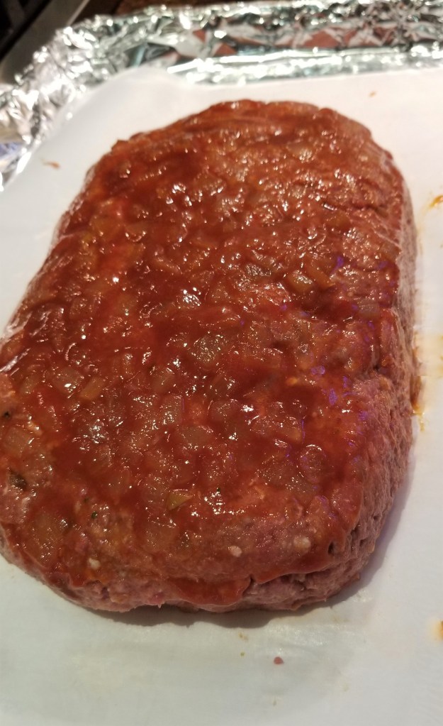 Place the mixture on a foil and parchment paper lined cookie sheet and form into a loaf, ensuring it is evenly shaped. I go for a longer loaf of about two or three inches in height. Spread the remaining tomato/onion mixture all over the top of the meatloaf.