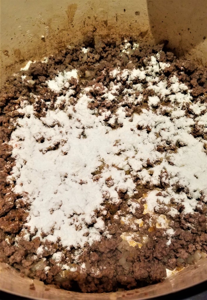 Sprinkle the flour and paprika over the meat and cook for three minutes to incorporate the flour and cook off the flour taste.