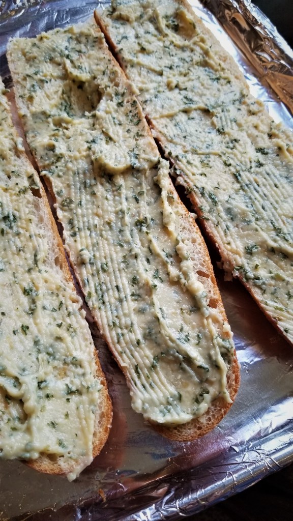 Step 4: Slice a loaf of Italian bread in half from end to end and top with the mixture. Place on a cookie sheet under the broiler till golden and toasted. (I usually put the sheet on the lower part of the oven to make sure the bread doesn’t cook too quickly).