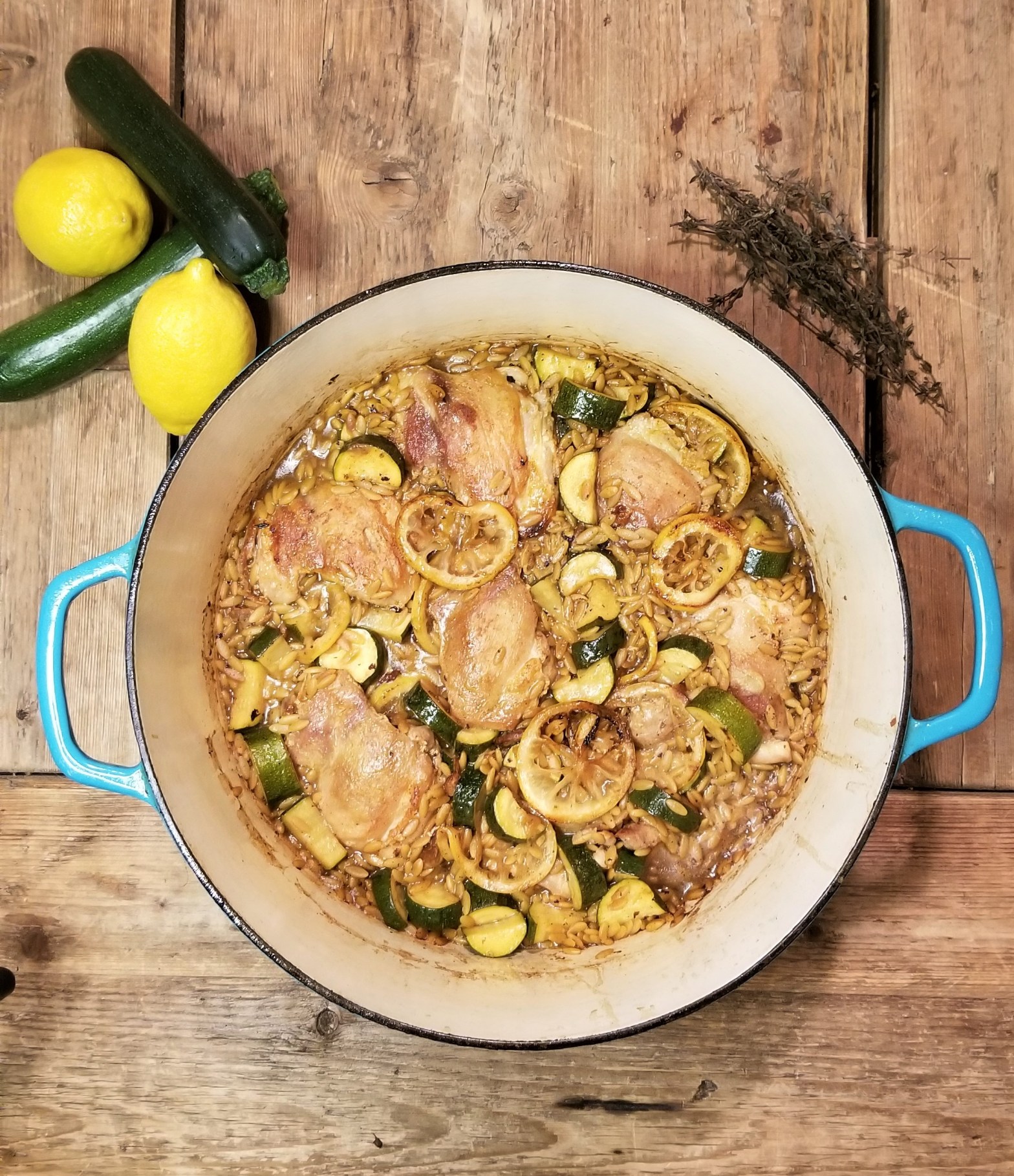 Lemon Chicken Thighs with Zucchini and Orzo is a great weeknigh, one pot meal in less than an hour.